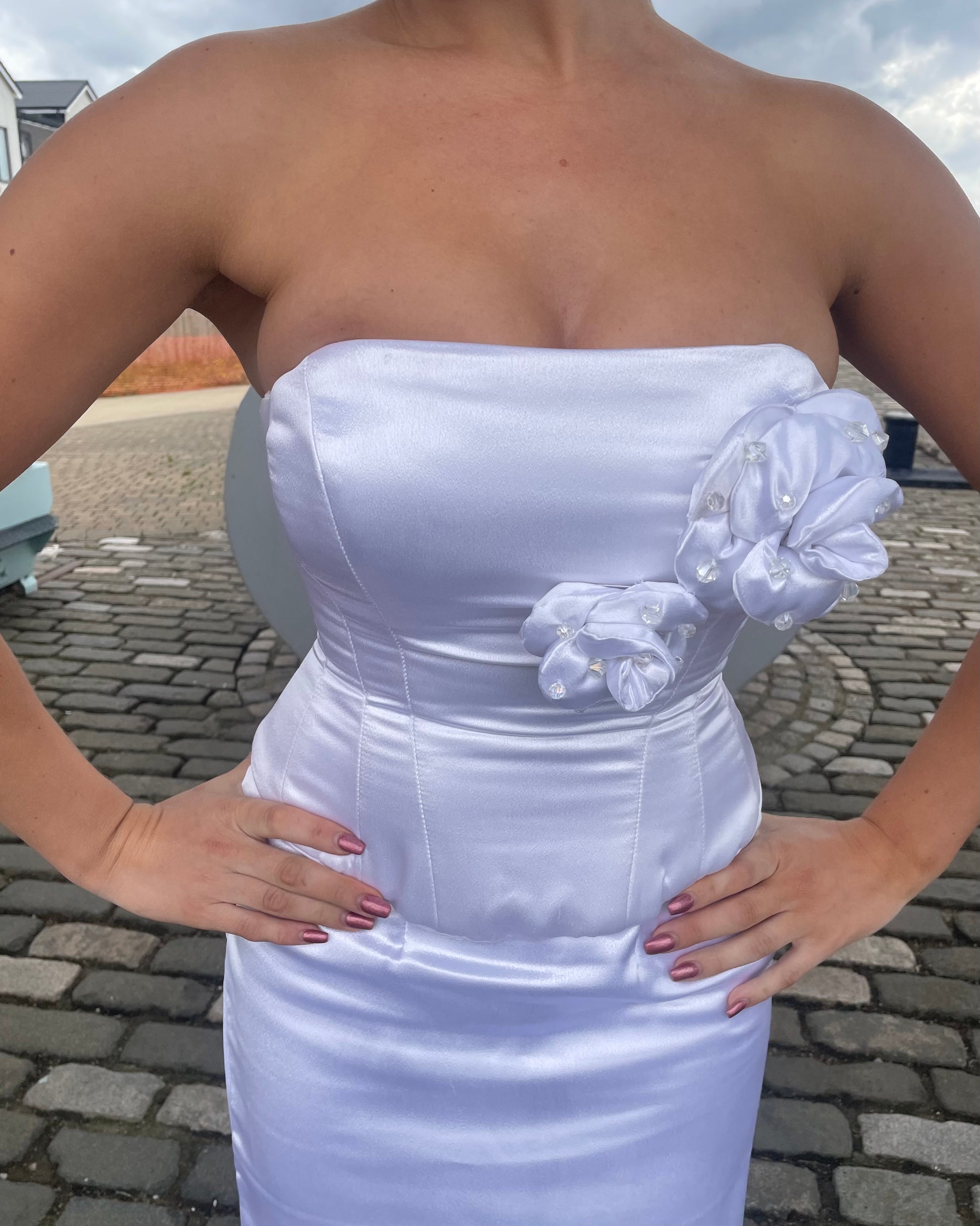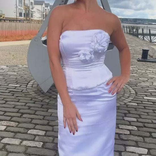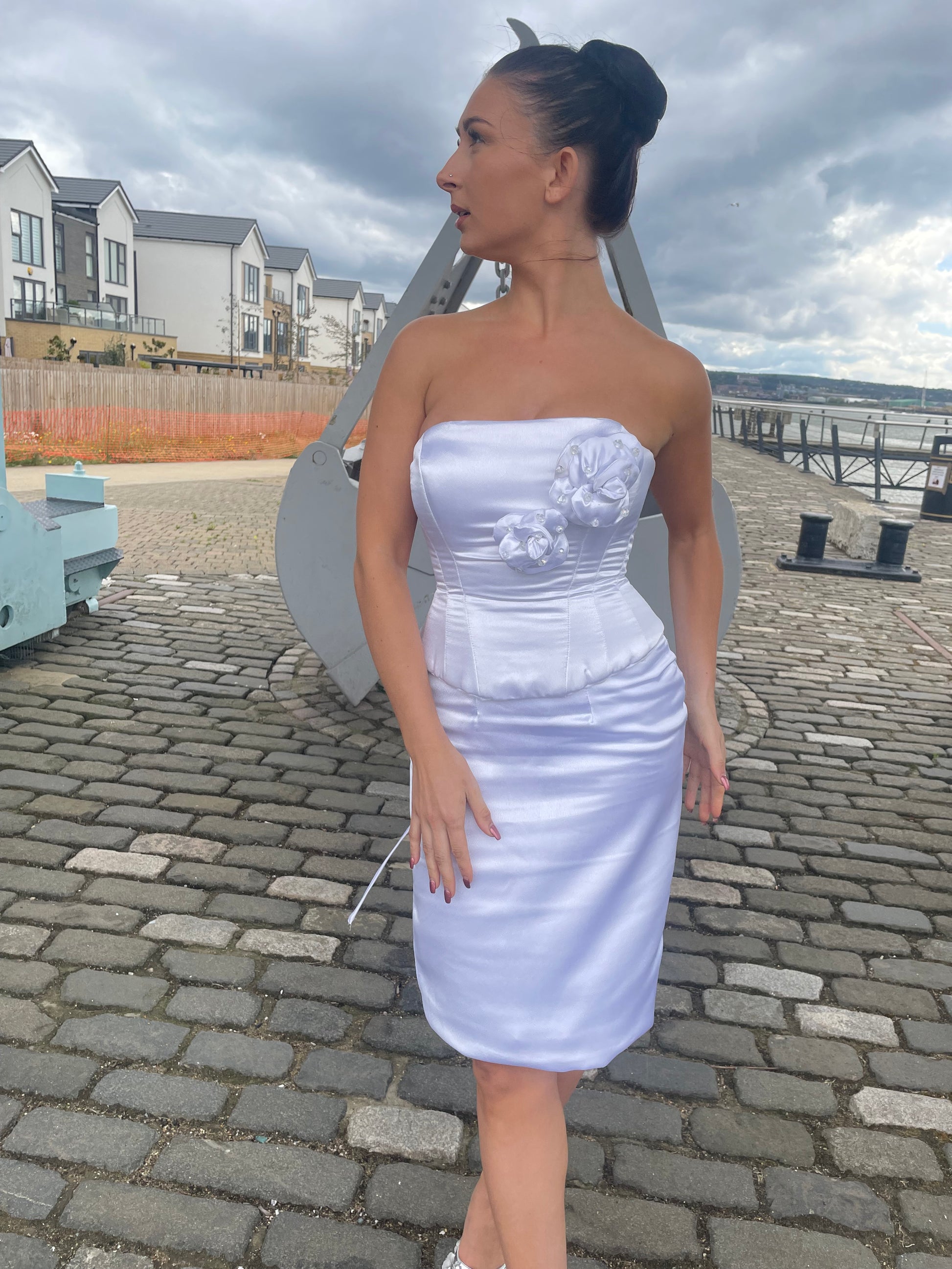 The Elizabeth Corset Set is a satin ensemble featuring a fully boned lace-up corset and a sleek knee-length pencil skirt. Made to measure for the perfect fit, this set combines elegance, structure, and modern sophistication.